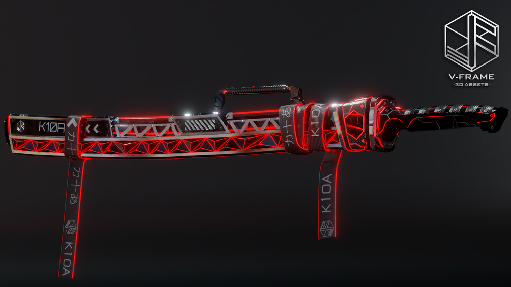 Welcoming the energy katana, "K10A". Top of the range cyber katana with red highlights, black hints and custom straps. Comes with full handle, custom made case, and geometrically serrated blade powered by electric rods.